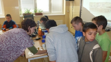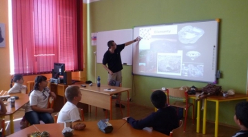 Úžasné tajomstvá „života v dávnych dobách“ deťom odhaľovala Natália Hudáčková a Silvia Králiková z Katedry geológie a paleontológie, ktoré priniesli množstvo skamenelín, špeciálny mikroskop a viacero obrázkov a videoprojekcií, a touto pútavou prezentáciou deti ihneď zaujali.